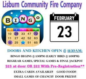 Join us for a fun-filled evening of bingo on February 23 at the Lisburn Community Fire Company located at 1800 Main St., Lisburn. Doors open at 11:30 a.m., with the Early Bird games starting at 1:00 p.m. Regular bingo games start at 1:30 p.m.