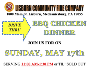 Join the Lisburn Community Fire Company on the Fairgrounds on Sunday, May 17, 2020 from 11:00 a.m. to 1:30 p.m. for the return of its Drive-thru Chicken BBQ Dinner.